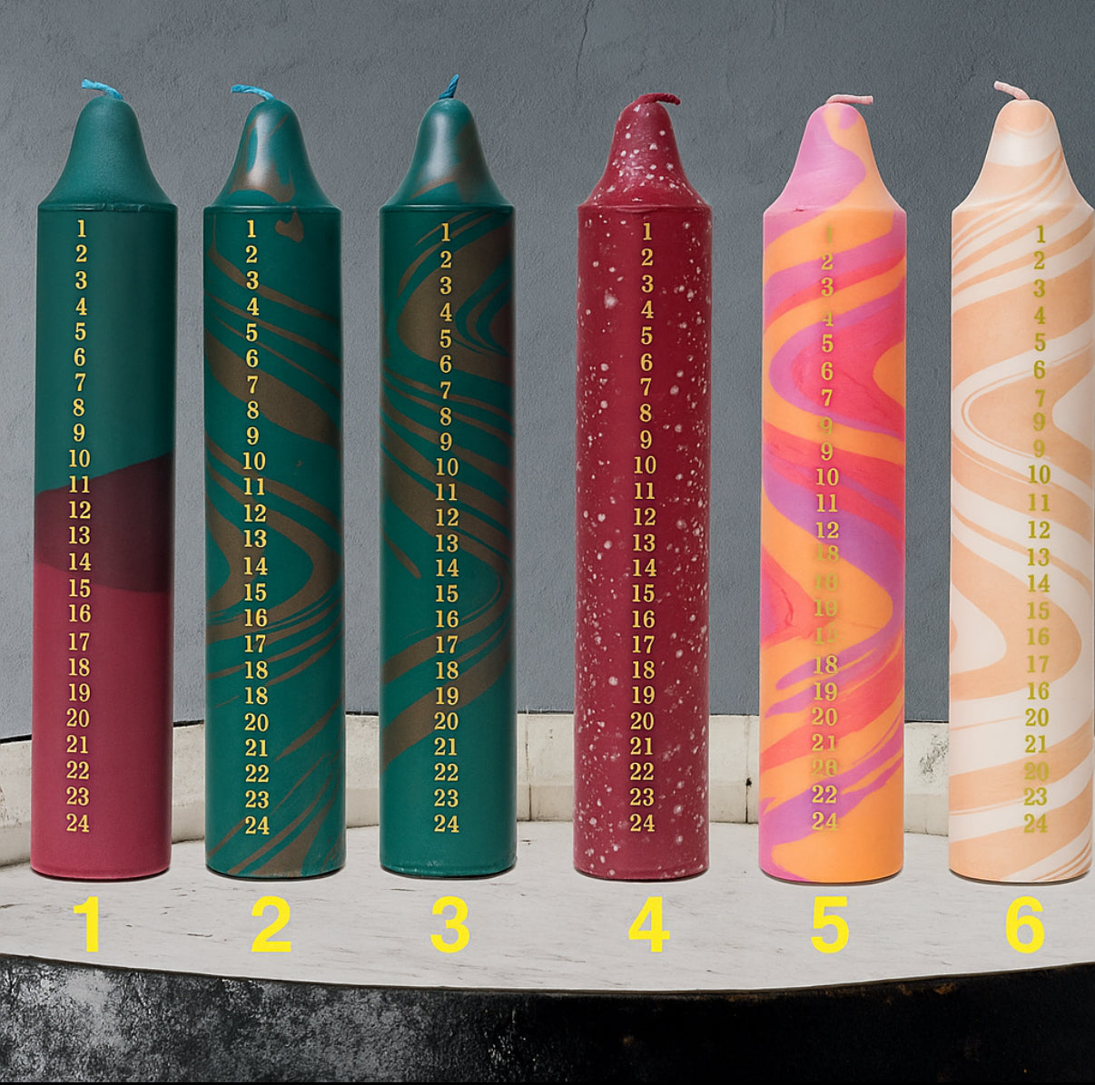 Adventskerze, Weihnachtskalender, Mischung aus Rot- und Grüntönen
